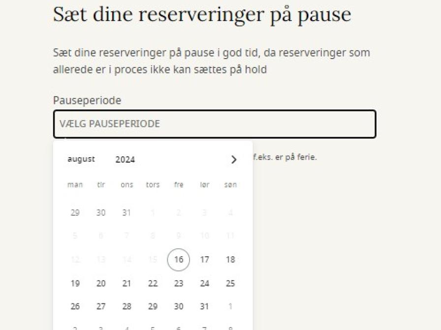 Hvis du ikke har mulighed for at komme og hente dine reserveringer i en periode, kan du angive en pauseperiode. Det betyder, at dine reserveringer bliver sat på pause.